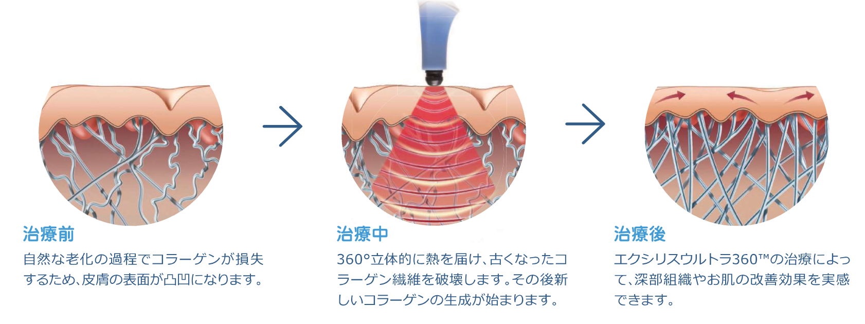 エクシリスウルトラ360の高周波と超音波が360°立体的に熱を届けることで、コラーゲンの生成が始まります。